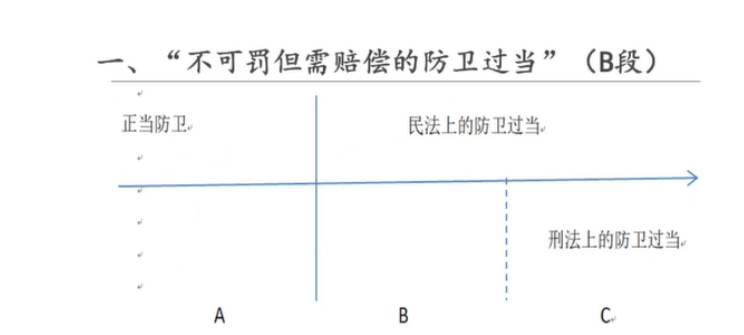 在超出正当防卫的界限之后,防卫过当没有“明显超过必要限度、造成重大损害的”,只能成立民法上的防卫过当(B段),而不成立刑法上的防卫过当(C段),因为如果成立刑法上的防卫过当,这就要成立犯罪,这显然是更严重的法律后果。准确而言,陈璇教授是在倡导“不可罚的防卫过当”(B段)的存在。
